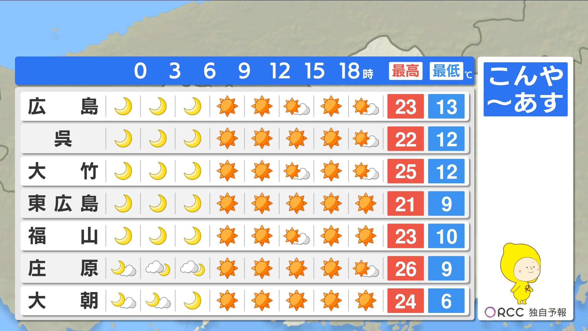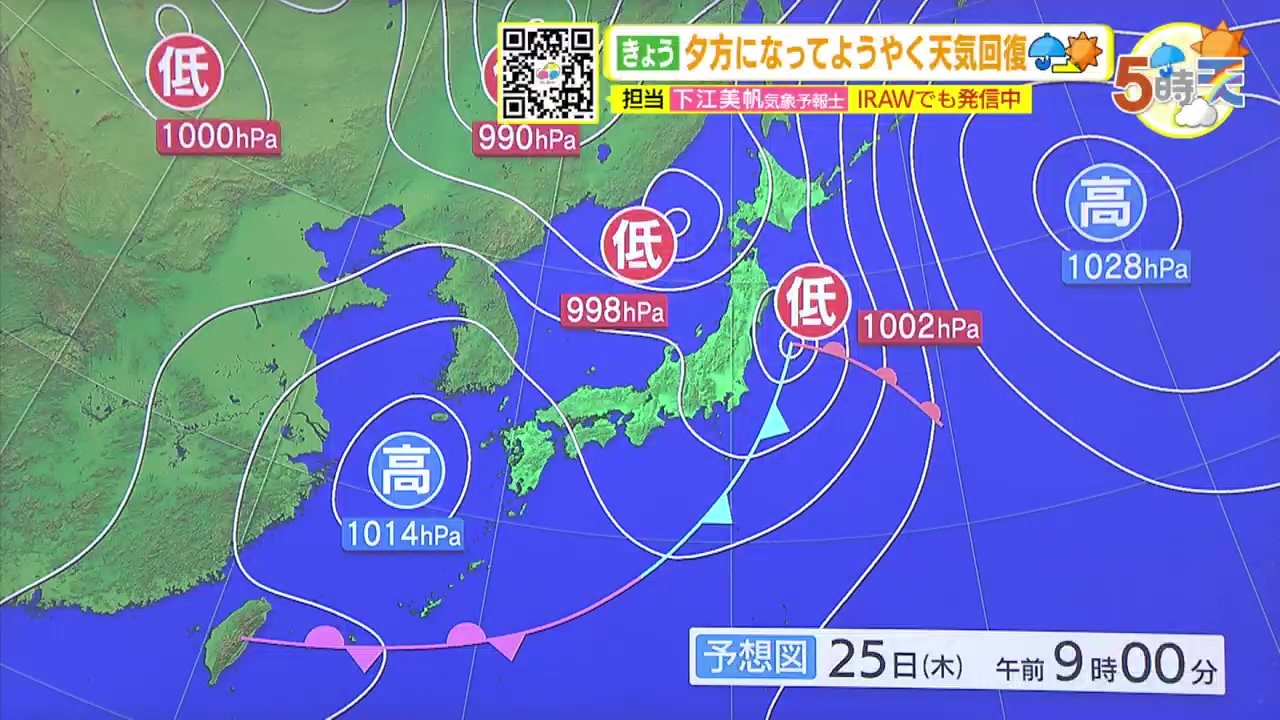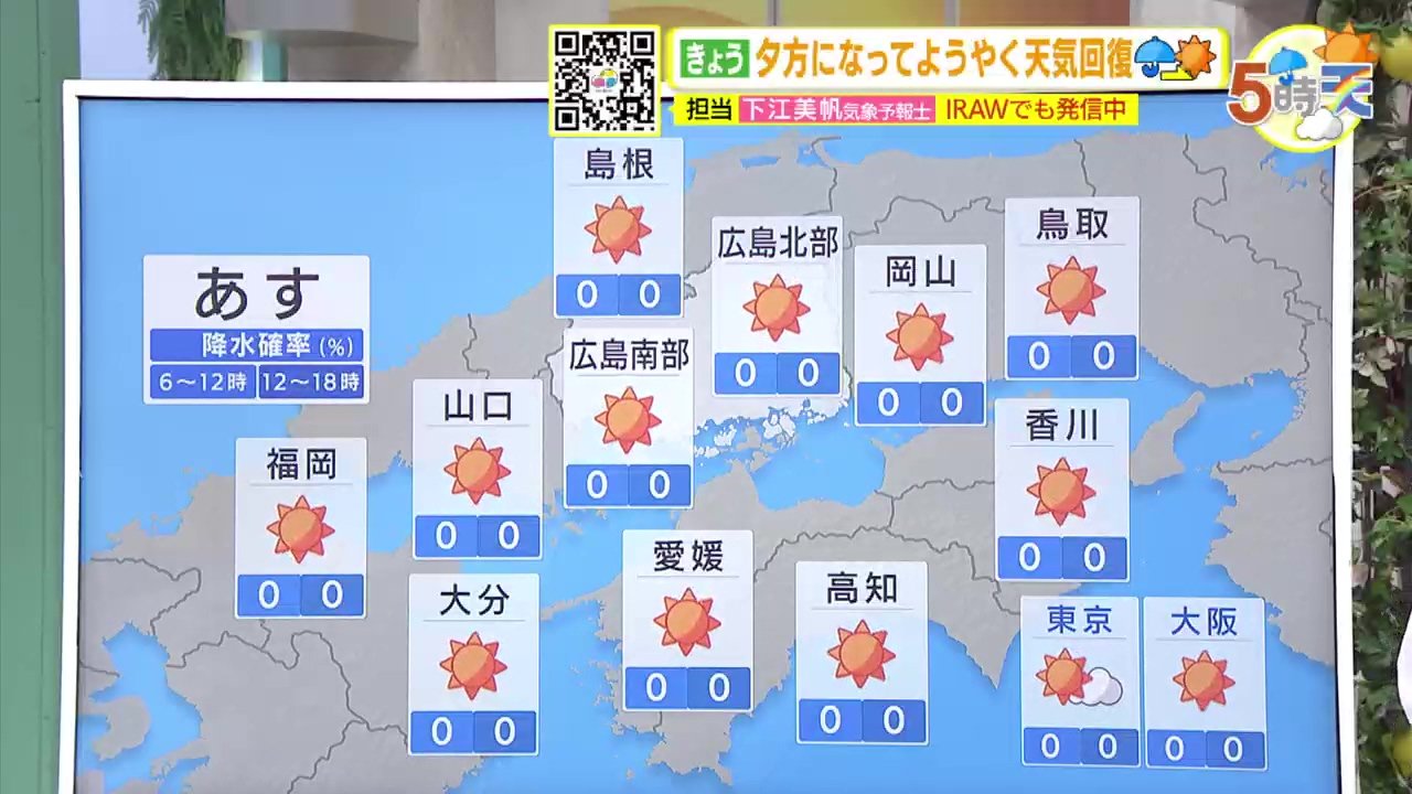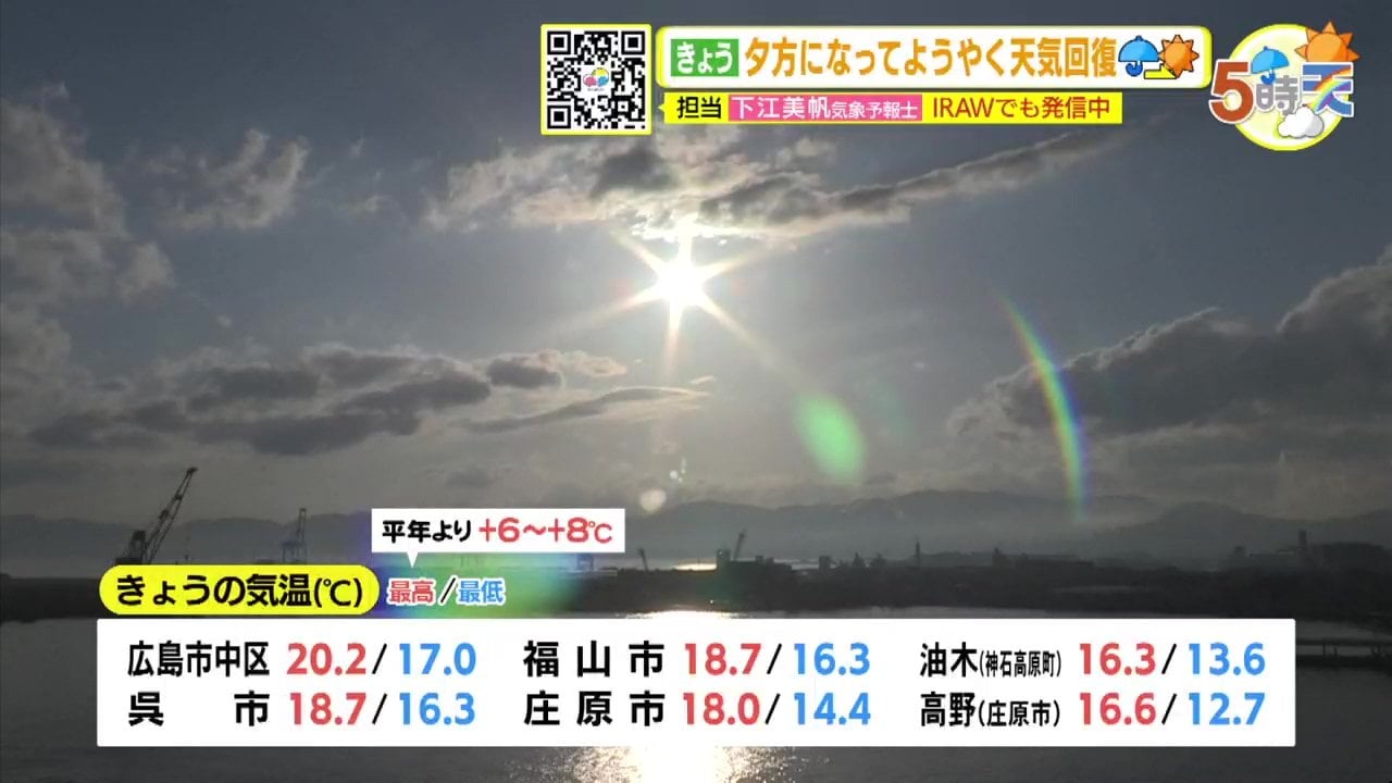 きょう24日(水)の広島県内は、昼すぎまでは時々雨が残ったところもあり、きのうの予報よりは天気の回復がやや遅くなりました。ただ夕方以降は晴れて来た所が多くなっています。朝の気温はけさも記録的に暖かく、平年に比べて6~8℃も高い最低気温でした。日中は20℃に届かない所が多く、ややヒンヤリと感じた方もいたかもしれません。