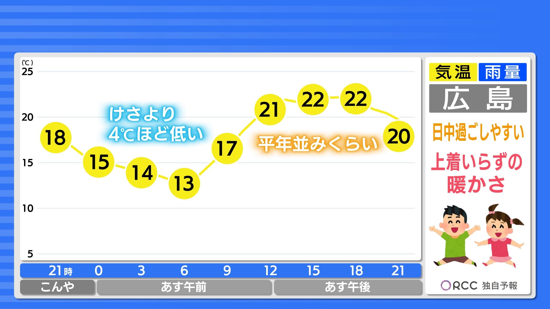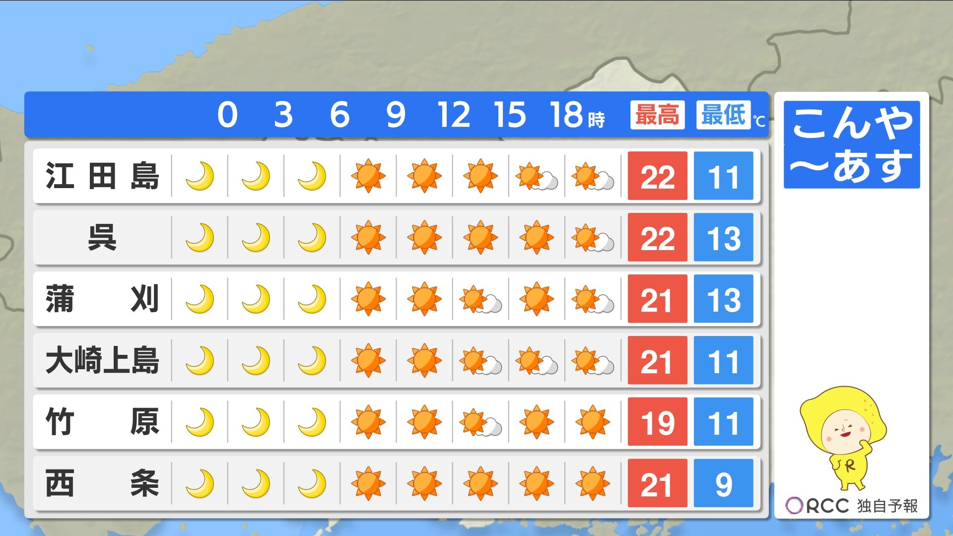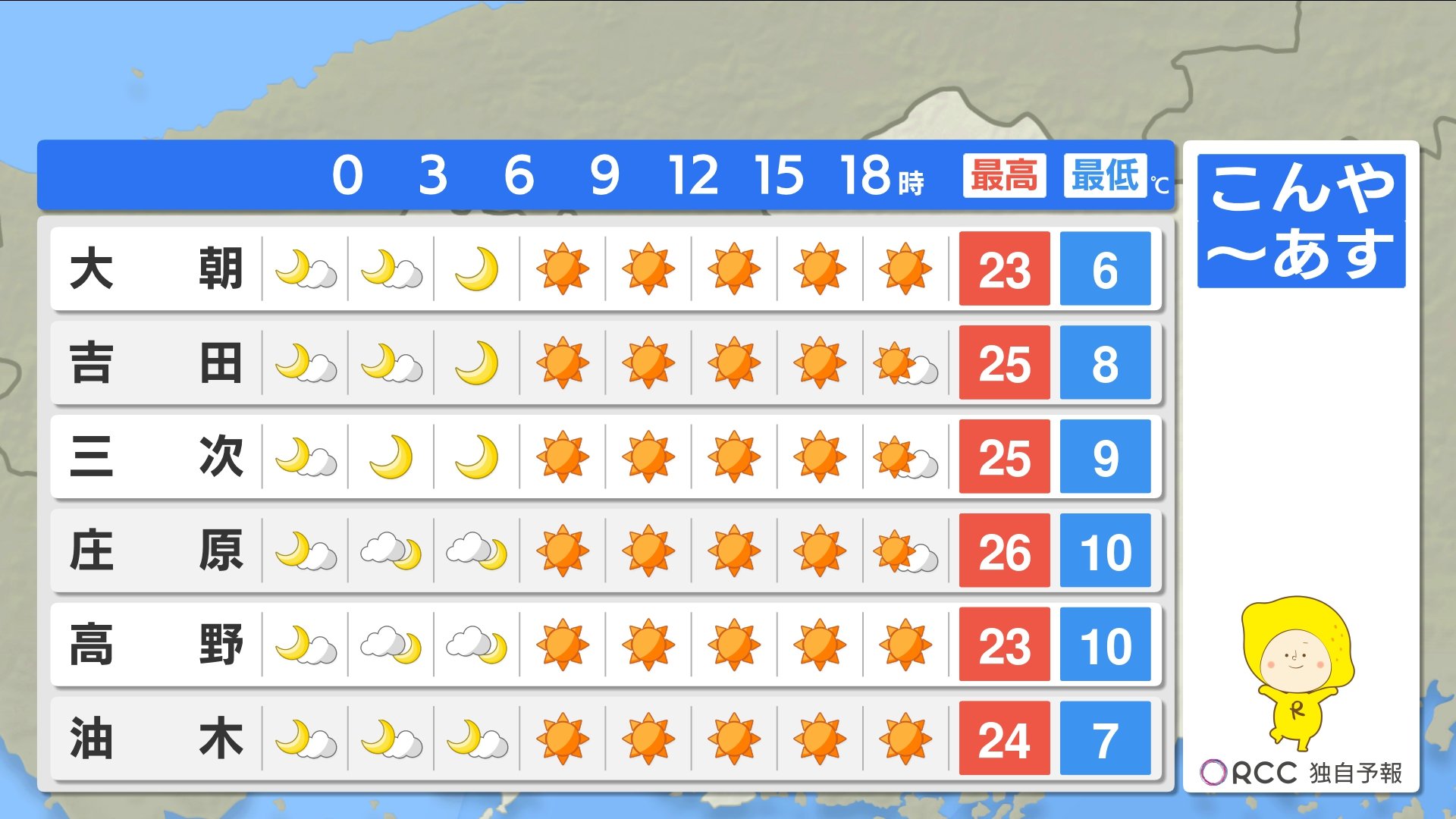 きょう24日(水)の広島県内は、昼すぎまでは時々雨が残ったところもあり、きのうの予報よりは天気の回復がやや遅くなりました。ただ夕方以降は晴れて来た所が多くなっています。朝の気温はけさも記録的に暖かく、平年に比べて6~8℃も高い最低気温でした。日中は20℃に届かない所が多く、ややヒンヤリと感じた方もいたかもしれません。
