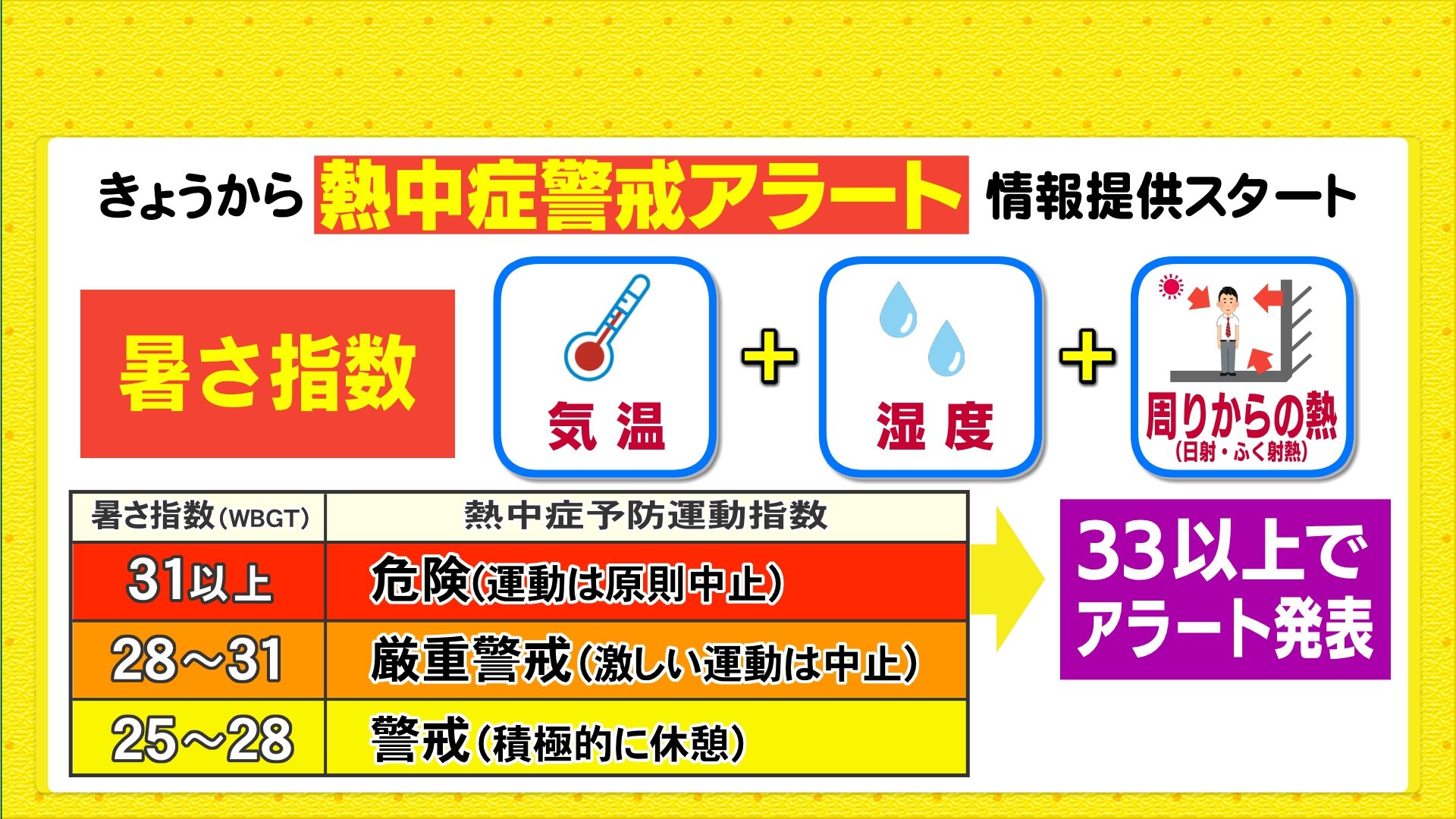 そしてきょうからは今年の「熱中症警戒アラート」の情報提供がスタートしました。気温や湿度、周囲からの熱などを元に計算される暑さ指数の値をベースに熱中症に対する危険度を表し、特に危険な状況になった場合にアラートを発表します。今年からはさらに記録的な暑さに対して警戒を呼びかける「熱中症特別警戒アラート」の発表も始まっています。
