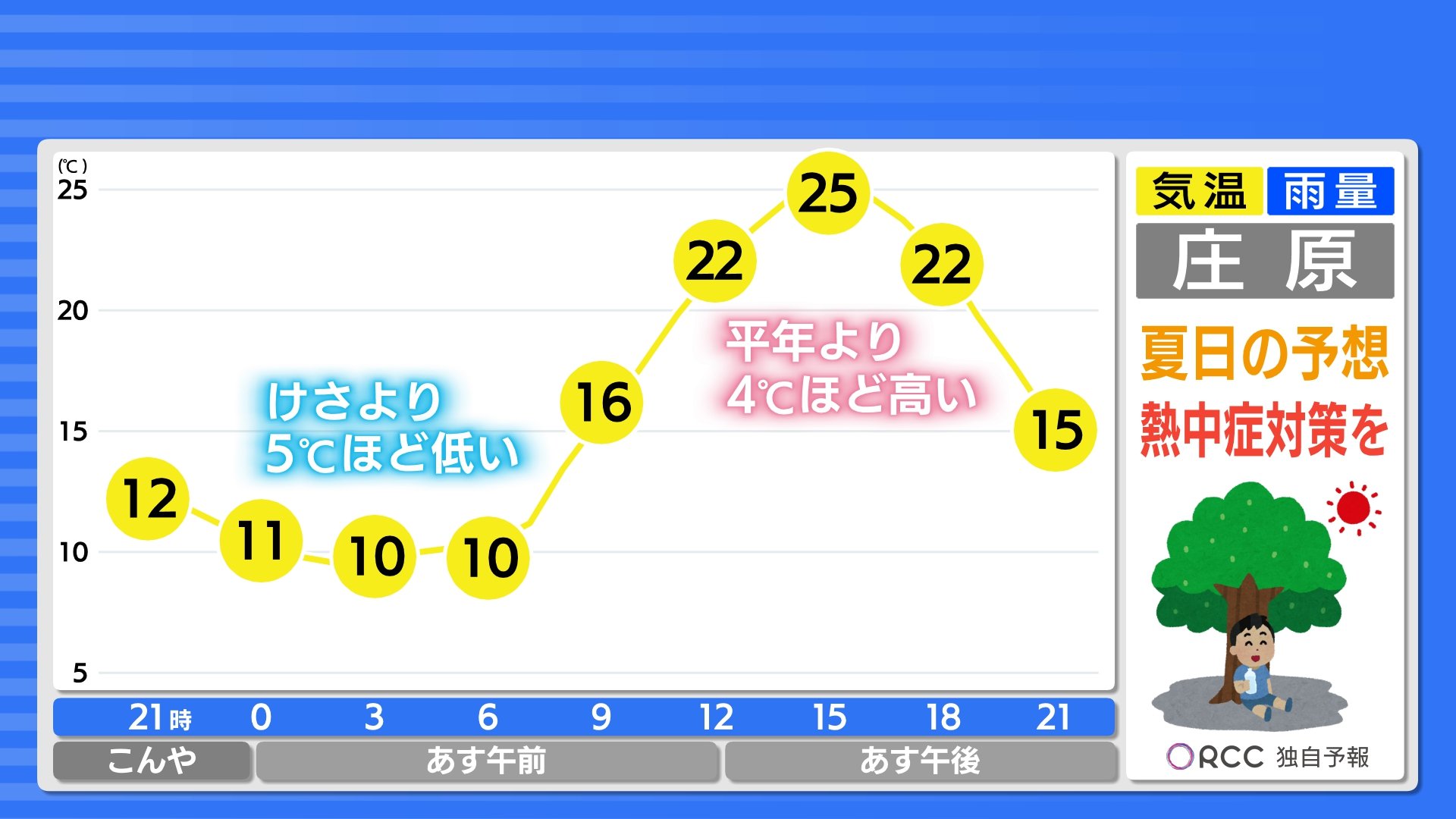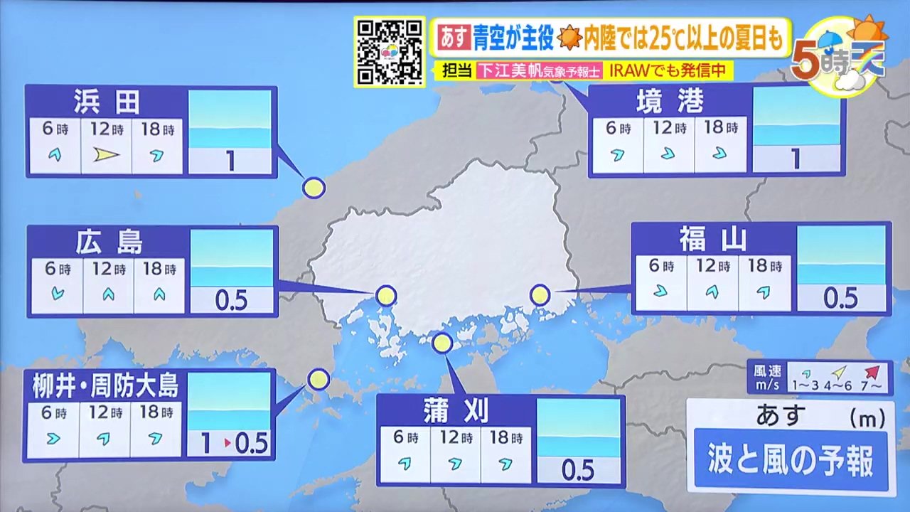 あすは1日を通してよく晴れるでしょう。中国山地の一部では未明から早朝に多少低い雲か霧が広がる可能性があるかもしれません。すでに日差しが強いためご注意ください。