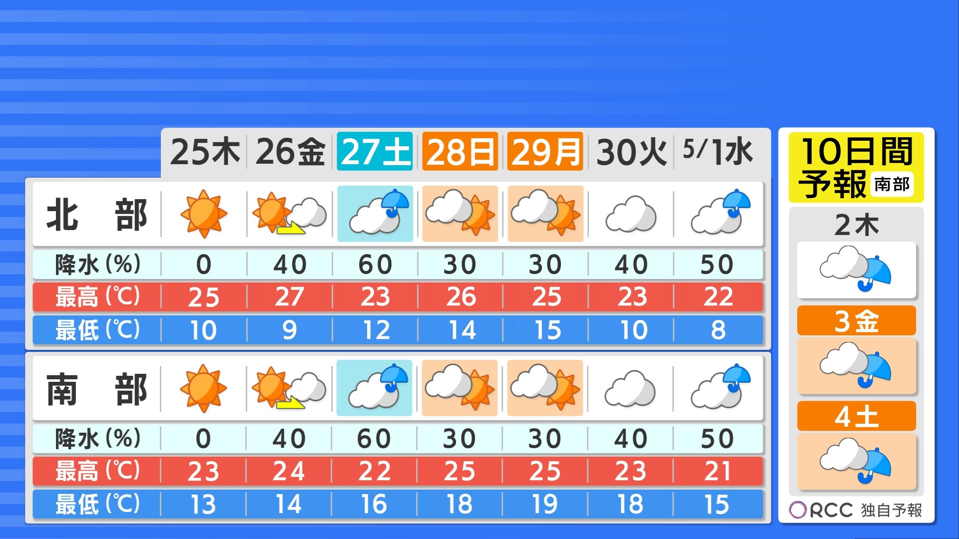 あさって金曜は午前中は晴れ間があっても次第に雲が増えてきて天気は下り坂です。GW初日の土曜は雨が降る予想です。3連休は日・月と晴れ間はありますが雲が目立つ天気となります。その後も前線の影響を受けてスッキリしない日が多くなる予想となっています。まだ予報にブレ幅があるため予報は変わる可能性はありそうです。