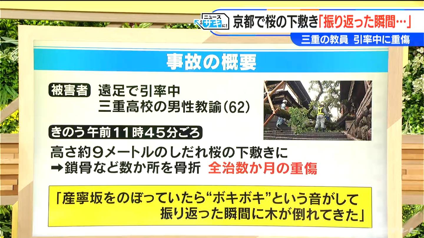 今回下敷きになってしまった被害者は遠足で引率中の三重高校の男性教諭(62)でした。23日午前11時45分ごろ、高さ約9メートルのしだれ桜の下敷きになり鎖骨など数か所を骨折し全治数か月の重傷を負いました。