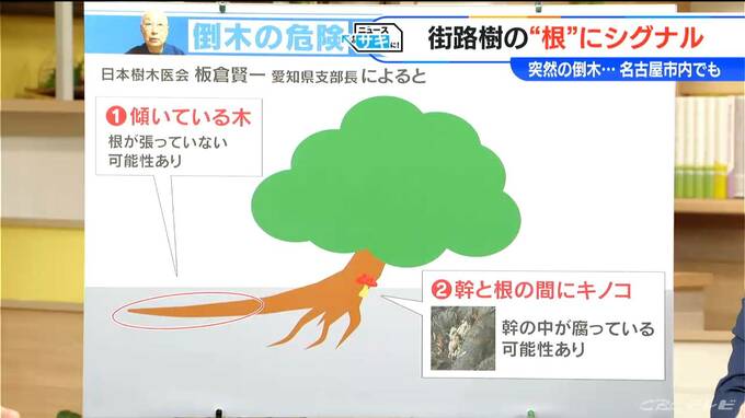 そして、もう1つのポイントはキノコが生えている木です。木が古くなってくれば、枯れた枝などにキノコが生えることはときどきあるということですが、危ないのは「幹と根の間に生えるキノコ」です。これは幹の中が腐っている可能性があって、根元のキノコというのは木が倒れるシグナルの可能性があると。そんな街路樹を見かけたら、自治体に伝えてほしいと板倉さんは仰っていました。