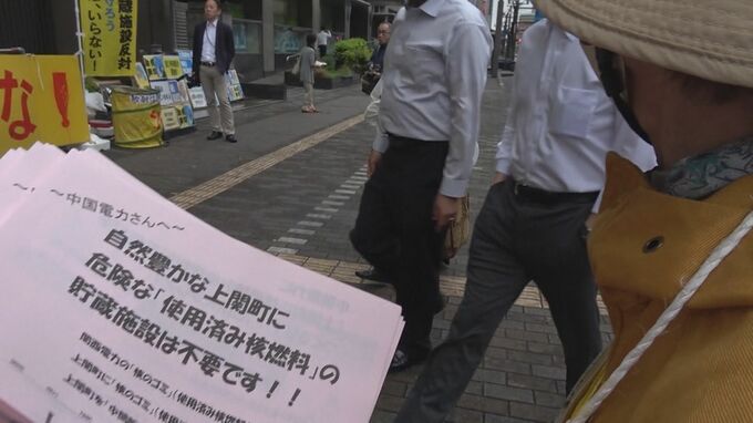 広島市中区にある中国電力本社前には、「ボーリング調査やめろ!」と書かれた黄色いプレートが掲げられ、中国電力の社員や道行く人にビラが配られました。