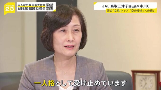4月、JAL初の女性トップとして新たに就任した鳥取三津子社長。初めての「客室乗務員」出身でもあるなど、“異例ずくめ”の経歴が注目されています。小川キャスターが重責を担う覚悟を聞きました。