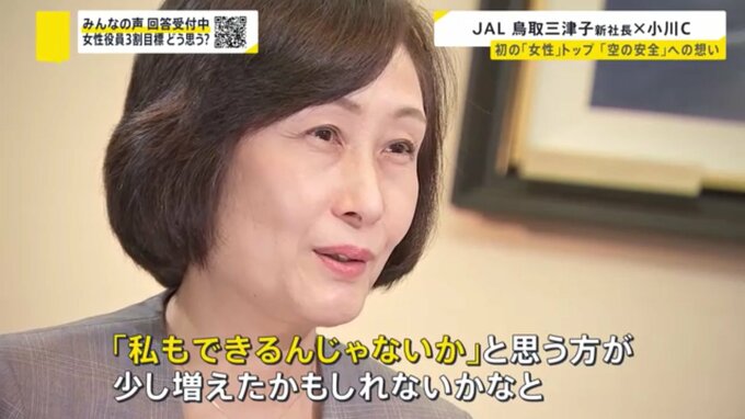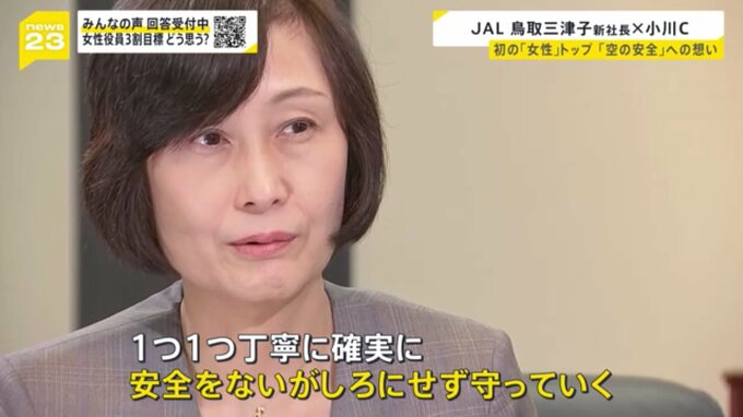JAL初の女性トップを務める鳥取社長。インタビューの終盤、抱負をこう話しました。