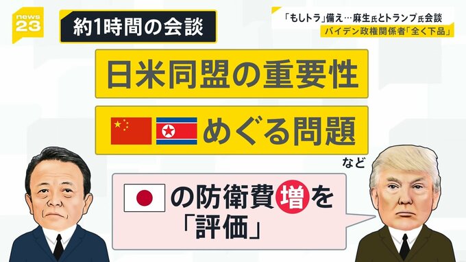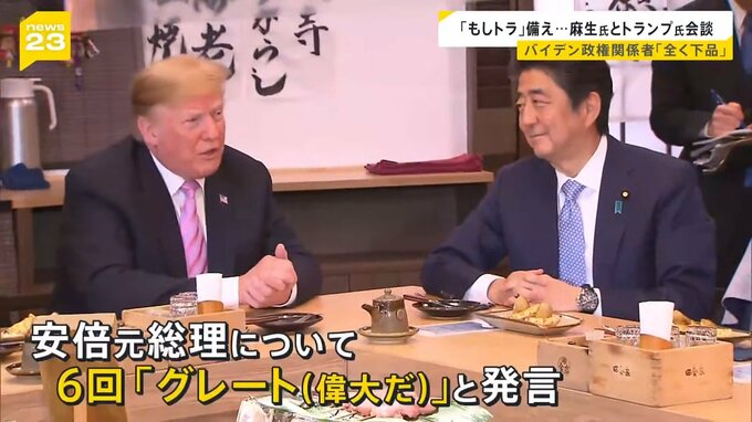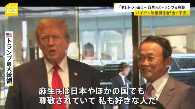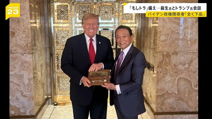 自民党の麻生副総裁が、アメリカのトランプ前大統領と会談しました。11月の大統領選挙でのトランプ氏の再選、いわゆる「もしトラ」に備えた動きですが、バイデン政権関係者は「まったく下品」だと眉をひそめています。