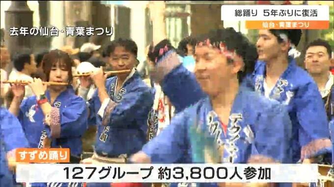 仙台・青葉まつり協賛会によりますと、40回目となる今年の「仙台・青葉まつり」は5月18日から2日間の開催で、メインの「すずめ踊り」には127グループ、およそ3800人が参加し祭りを盛り上げます。さらに、コロナ禍の影響で取りやめとなっていた一般の観客もすずめ踊りに参加できる総踊りが5年ぶりに復活します。また、定禅寺通りに有料の桟敷席434席が設置されることになりました。