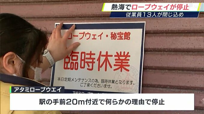 当時、アタミロープウエイは営業開始前で従業員13人を乗せたゴンドラが頂上駅に向けて上っていたところ、駅の手前20m付近で、何らかの理由で停止したということです。