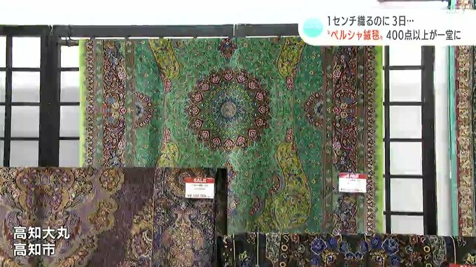 織り目が細かく肌触りのよいペルシャ絨毯の展示・販売会が高知市で始まりました。1センチ織り進めるのに3日かかるというペルシャ絨毯。職人たちが丹精込めて作った絨毯の数々が所せましと並んでいます。
