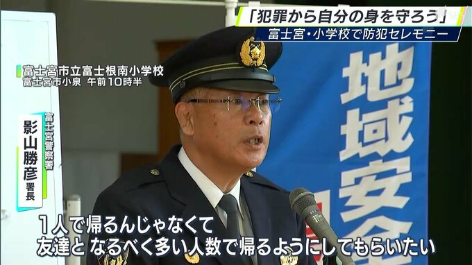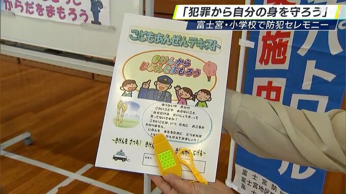 このセレモニーは、富士宮警察署や地域安全推進員などが、1人で歩く機会が増える1年生を対象に、誘拐や性犯罪から自分の身を守ってもらおうと、開きました。