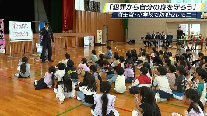 4月25日静岡県富士宮市内の小学校で、この春入学したばかりの1年生を対象に防犯セレモニーが開かれました。誘拐や性犯罪から自分の身を守ることが目的です。