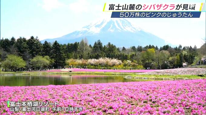 富士山の麓ではシバザクラが見頃を迎えています。ピンク色のじゅうたんのように広がる光景が来園者の目を楽しませています。