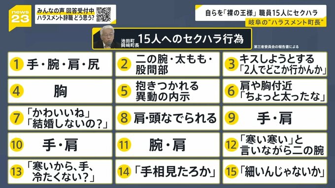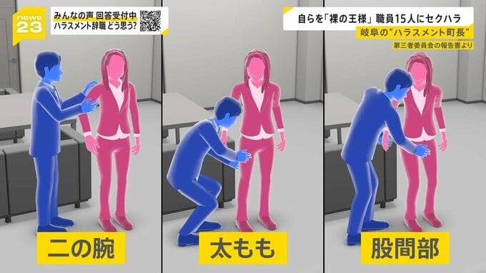 第三者委員会がまとめた報告書では、岡崎町長は15人に対し、▼手や肩や尻、胸を触る、▼キスをしようとする、▼抱きつくなどのセクハラ行為があったと認定。約20年前から行われていました。