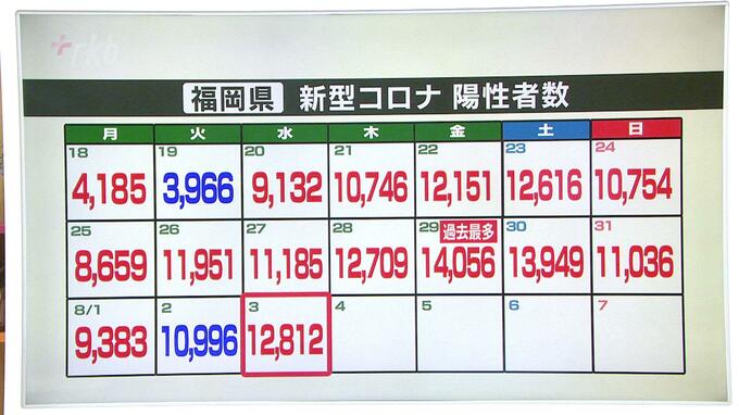 福岡県は3日、新型コロナウイルスの検査で新たに1万2812人が陽性だったと発表しました。発表自治体別の内訳は、福岡市が4752人、北九州市が2815人、久留米市が912人、そのほかの地域が433…