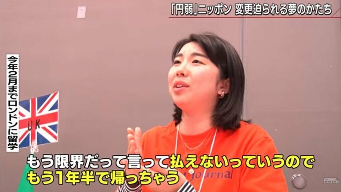 「(向こうにいた時)“1ドルいくら、今日はやばいよ”とか皆敏感に見ていました。もうちょっと払えないっていう限界が来てしまって、そうなると生活を楽しめない。ただお金を気にしちゃって…。これじゃ留学じゃないって…。そう思っちゃう人は途中で帰国しちゃう。私の友人にもいた。もう限界だって、払えないからもう1年半で帰っちゃう…」(元留学生)