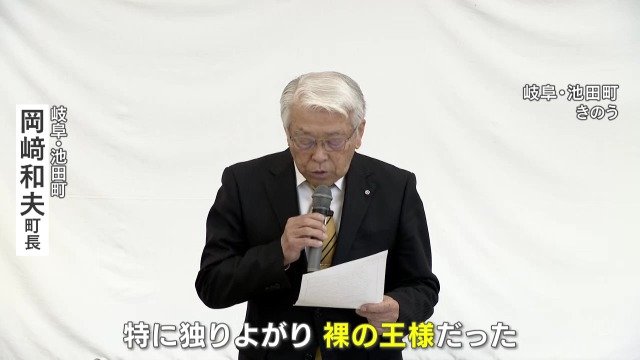 25日の会見で自らを「裸の王様だった」と振り返った、岐阜県池田町の岡﨑和夫(おかざき かずお)町長(76)。