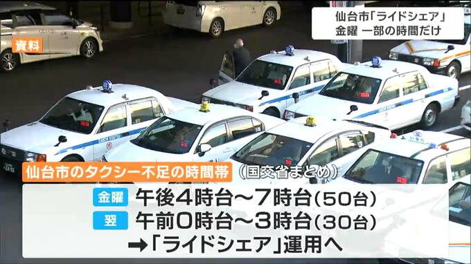 国土交通省によりますと、仙台市内では金曜日の午後4時台から午後7時台まで、日付けが変わった翌未明の午前0時台から午前3時台まで、それぞれ50台と30台、タクシーが不足するということです。このため仙台市内では、この一部の時間帯に限り「ライドシェア」が認められる見通しです。