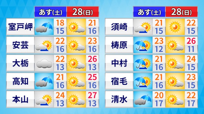 土曜の朝は沿岸部で雨がぱらつく所があるでしょう。ただ、午後から天気は回復し、日曜日にかけては天気の崩れはなくお出かけ日和となりそうです。