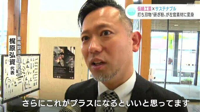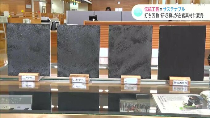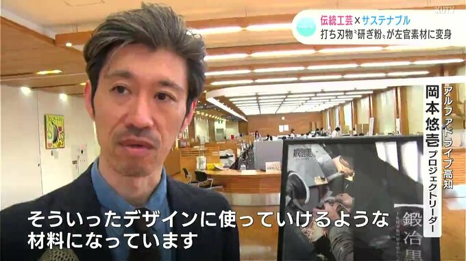新たに開発されたのは、左官に使う特殊素材の「鍛冶黒‐KAJIKURO‐」。細かい粒子の粉末に独自の樹脂を混ぜ、粘土状にしています。土佐打刃物の製造工程で出る“研ぎ粉”は、産業廃棄物として扱われてきましたが、四万十町の「黒鳥鍛造工場」と、土佐町の「アルファドライブ高知」が試行錯誤する中で新素材の開発にこぎつけました。