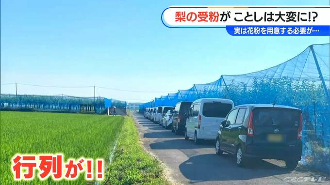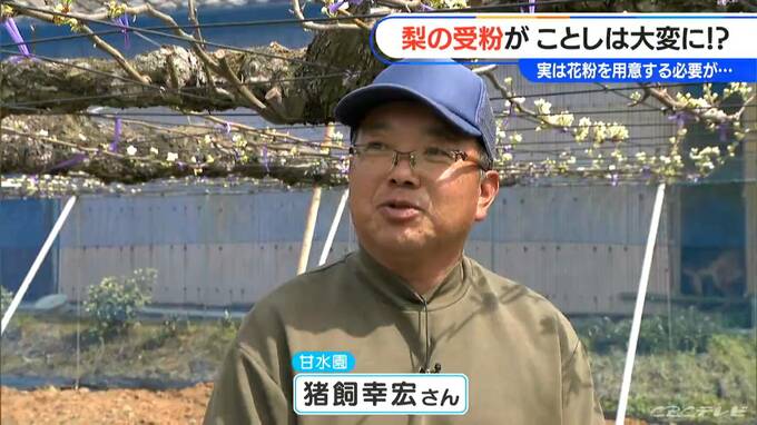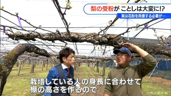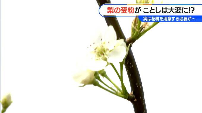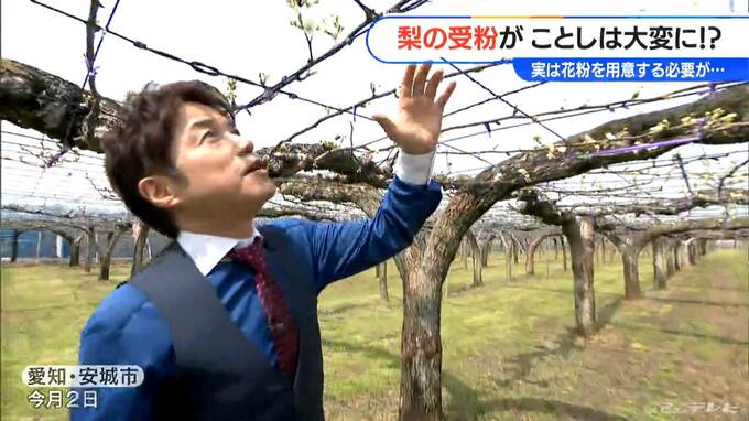 「こちらは、愛知県安城市にあります梨農園です。見てください。今、真っ白な花が咲いてますよね」