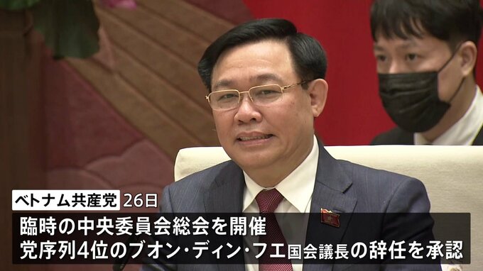 ベトナム共産党の序列4位にあたる国会議長の辞任が発表されました。最高指導部では、先月も序列2位の国家主席が辞任したばかりです。ベトナム共産党は26日、臨時の中央委員会総会を開き、党序列4位のブオン・ディ…