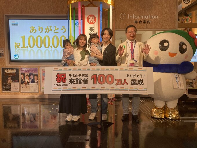 五泉市赤海にあるラポルテ五泉では27日午前10時半に、長岡市から来館した会社員の金子裕司さん(29)さん家族を招いて記念セレモニーが開かれました。くす玉を割りお出迎えをすると、五泉産のアスパラや越後姫、五泉ニットのサコッシュなどが記念に手渡されました。妻と3歳と0歳の娘と訪れた金子さんは今回で3回目の来館で、100万人達成に「びっくりしたけどうれしかった。五泉に来たらまた来たいです。」と話していました。