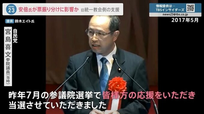 2016年の参院選で、比例当選した宮島喜文氏です。宮島氏は秘書を通じてニュース23の取材に応じ、教団側から選挙支援を受けた経緯を明らかにしました。
