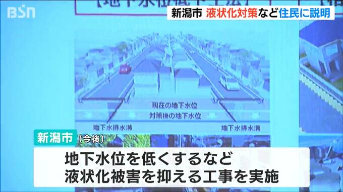 新潟市西区で開かれた説明会には地震で被害を受けた市民200人が参加しました。西区を中心に被害が多発した液状化現象。新潟市は再び地震が起きても液状化の被害が抑えられるようにするため住宅地などの地下水位を強制的に低くするなどの工事を今後行っていくと説明しました。工事を行うには該当する地域の住民全員の合意が必要で着手までに、2年から3年はかかるとしています。
