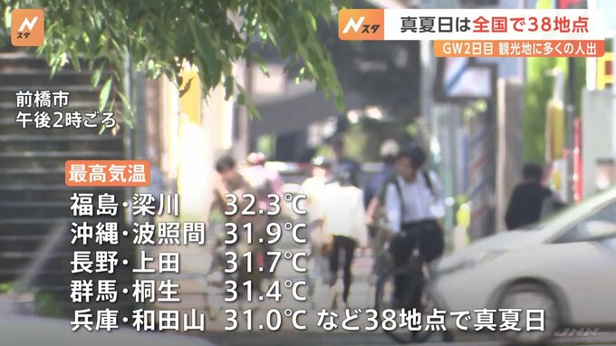 ゴールデンウイーク2日目のきょうは全国的に晴れて、各地で気温30度を超える真夏日となりました。行楽日和に、観光地は多くの人で賑わいました。きょうは、全国的に気温が上がり、福島県から沖縄県までの38地点で…