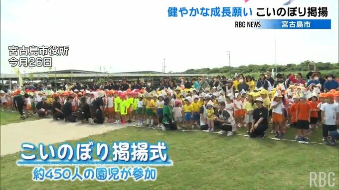 こいのぼり掲揚式は児童福祉週間に合わせて毎年行われているもので、市内29の保育園からおよそ450人の園児が参加しました。