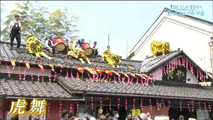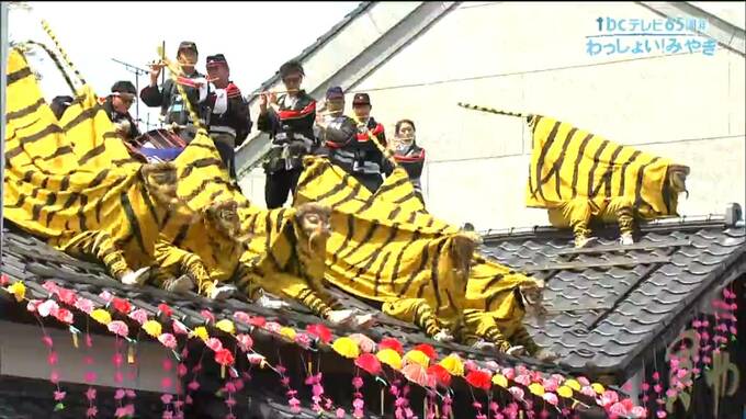 瓦屋根の上で勇壮な姿を見せる虎舞です。