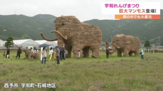一面にレンゲの花が広がる田んぼに稲わらで作られた巨大なマンモスが登場。愛媛県西予市宇和町で行われたゴールデンウィーク恒例の「宇和れんげまつり」です。29日は、あいにくの雨となり、巨大な臼を使う「…