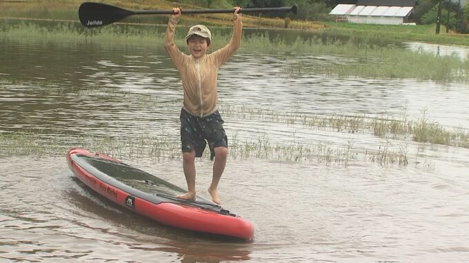 大分県竹田市の田んぼで人気のウォータースポーツ「SUP」の体験イベントが開かれ、家族連れなどが水上散歩を楽しみました。竹田市久住町にある田植え前の30アールの水田。地元の丸山自治会の人たちがボードの上に…