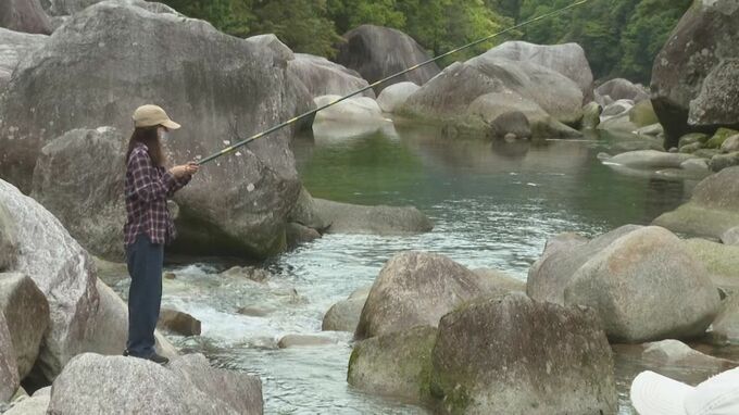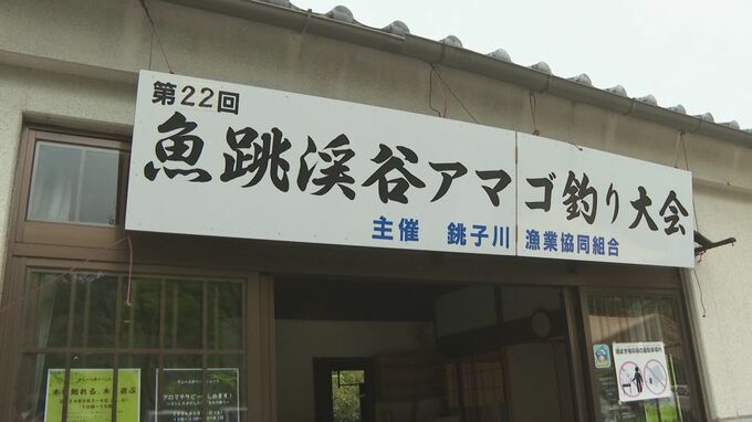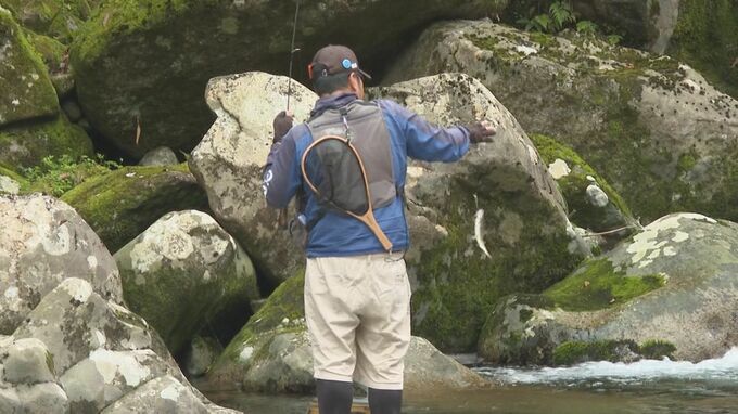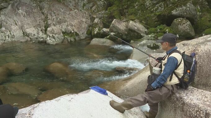 毎年、地元の漁協組合が大会を開いていて、ことしで22回目を迎えます。29日は地元周辺に加え、京都や和歌山など各地から集まった渓流釣りの愛好家46人が参加。上流の魚飛渓谷(うおとびけいこく)、およそ1キロに事前に放流された1000匹のアマゴを次々と釣り上げ、自慢の腕を競っていました。