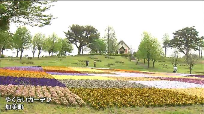 加美町の「やくらいガーデン」では、広さおよそ2400平方メートルの畑に、30種類およそ5万株のビオラが植えられ、県の内外から訪れた行楽客を癒しています。やくらいガーデンによりますと、今年は、4月中旬から咲き始め例年より10日ほど開花が早く進んでいるということです。