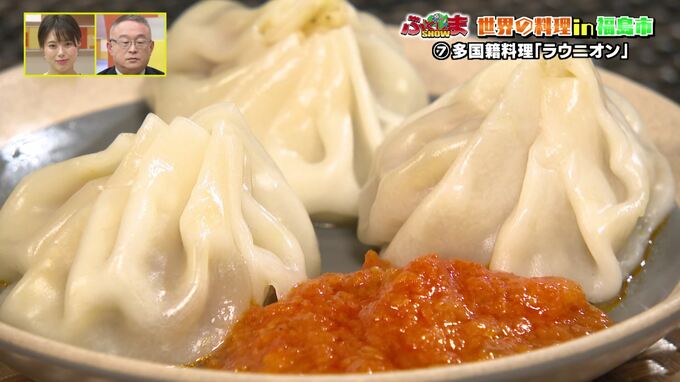 豚ひき肉にカレー粉を練り込んだ、ネパールの小籠包「モモ」。トマトソースをつけていただきます!