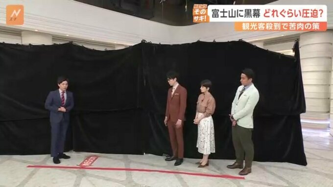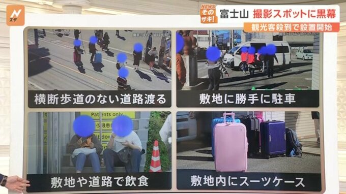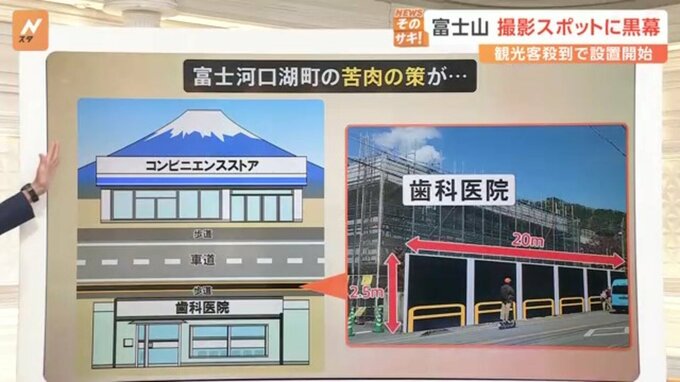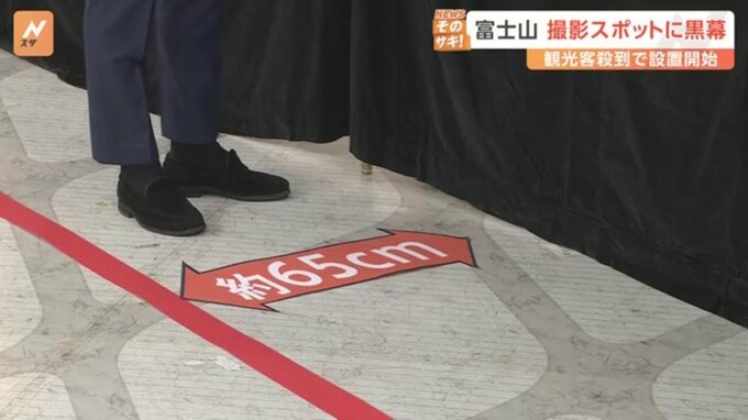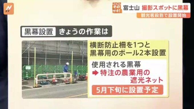 富士山 撮影スポットに黒幕 観光客殺到で設置開始