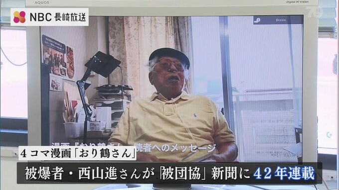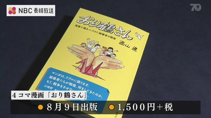 一冊の単行本として出版されることになった「おり鶴さん」。長崎原爆の被爆者、西山進さんが日本被団協の新聞に去年まで42年に渡って連載してきた4コマ漫画です。500回に及んだ連載のうち335作品が時代解説を交えて収録されており西山さんら被爆者の歩みや政治への憤り、平和への思いを優しいタッチで伝えています。