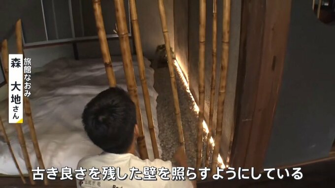 「ここの照明だと、間接照明。砂利の奥に間接照明を忍ばせて、下から照らすようにして、古き良さを残した壁を照らすようにしている。和モダンみたいな感じです」