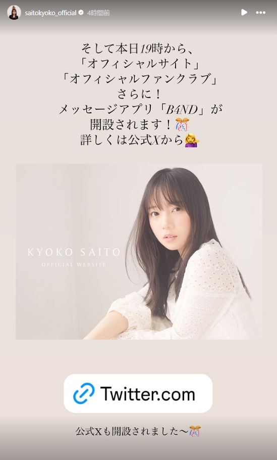 さらに齊藤さんは、インスタグラム・ストーリーズで、自身のオフィシャルサイトとファンクラブ、そして公式Xアカウントの開設を発表。公式Xでは早速動画で挨拶コメントを投稿しています。