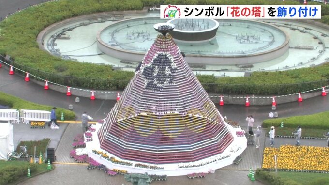 5月3日から始まる「ひろしまフラワーフェスティバル」を前に、シンボルの「花の塔」に飾り付けが行われました。赤い花はカーネーション、黄色はマリーゴールド、そしてペチュニアもそろえられました。およそ8000鉢…