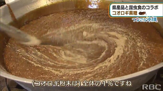 「こちらがコオロギの粉末になりますね。黒糖全体がだいたい30キロだとすると300グラムです。コオロギの粉末は全体の1%ですね!」