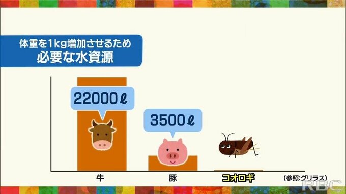 食用コオロギの研究などを行うグリラスによると、畜産物の体重を1キロ増加させるために必要な水資源は、牛が22000リットル、豚が3500リットルに対しコオロギはたったの4リットル。