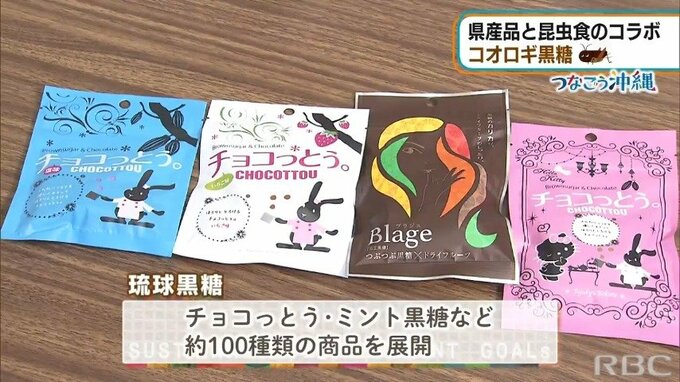 製造を行うのは、糸満市西崎にある琉球黒糖。1番人気のチョコっとうをはじめミント黒糖や塩黒糖などおよそ100種類の商品を展開しています。