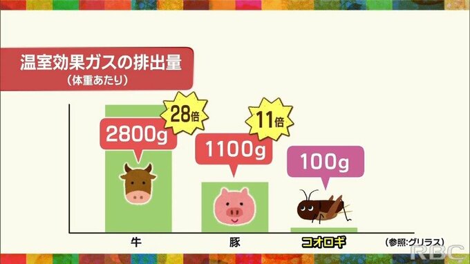 「一般的な家畜と比べると、餌や水分が少なくすてむという部分と、育成するための土地が少なくてすむ、それを踏まえることで、温室効果ガスとか二酸化炭素などの部分で環境に良いんじゃないかとも言われています。」