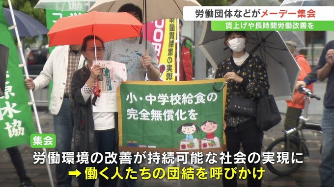 集会では団体の代表者らが賃上げが物価上昇に追いついていないことに加え、長時間労働の改善や男女の格差の是正などが図られていない現状などを訴えました。