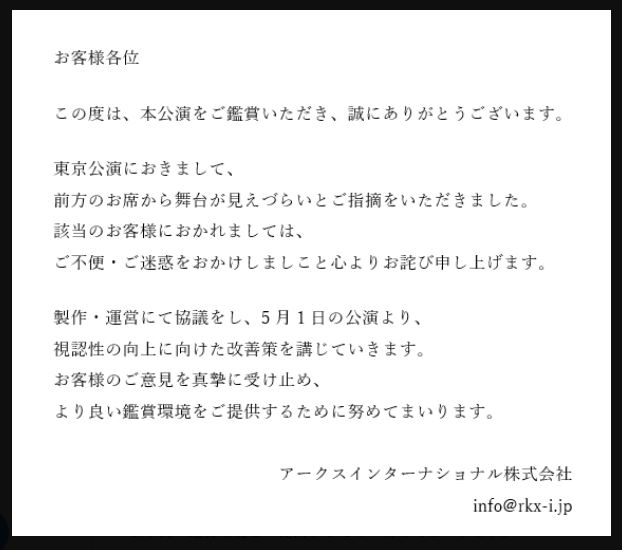 Xでは、「東京公演におきまして、前方のお席から舞台が見えづらいとご指摘をいただきました。該当のお客様におかれましては、ご不便・ご迷惑をおかけしましたこと心よりお詫び申し上げます」と謝罪しました。