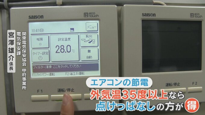 「外気温が35度以上であればつけっぱなしの方がお得になります。また30度前後であればこまめに消していただく方がよいかと思います」