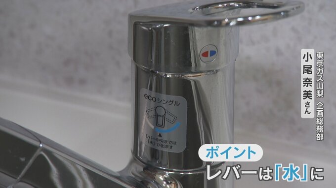 「実は皆さん気づいていないかもしれないポイントがありまして、お水で食器を洗っているつもりでも、お湯を使っている事がありまして、レバーを使いやすい真ん中で使っているとお湯と水がまじりあっている事がある」